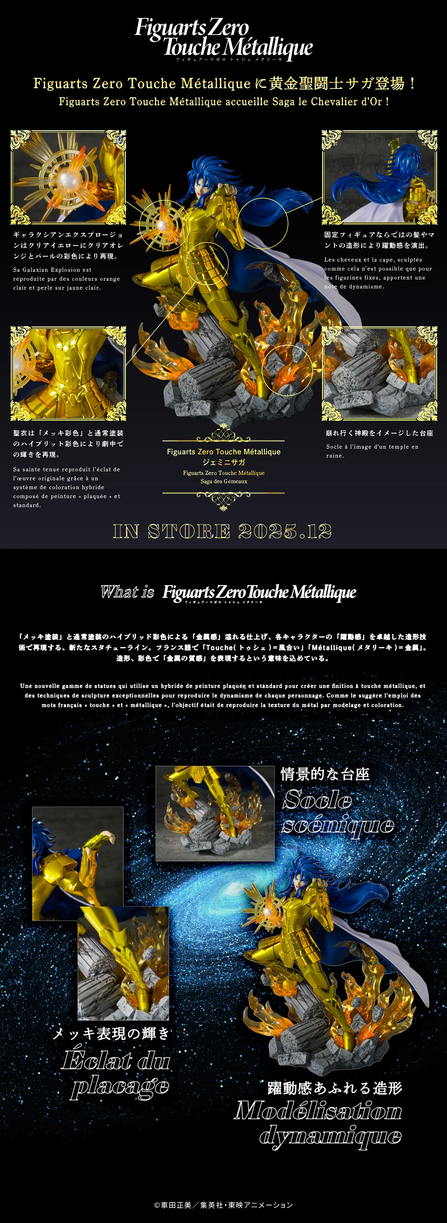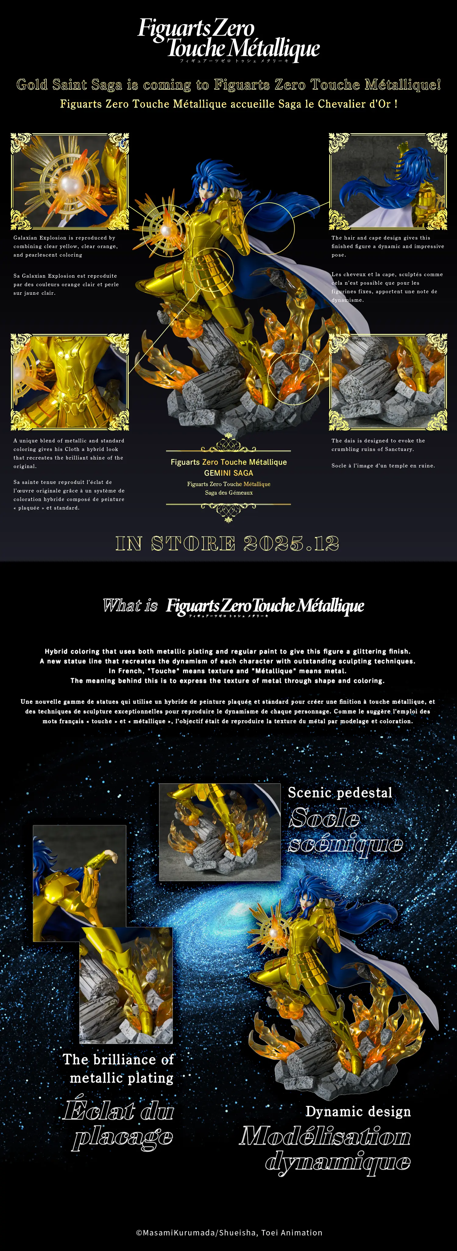 マントをたなびかせ今まさに技を放たんとする「ジェミニサガ」を立体化。聖衣の一部をメッキパーツで表現し、固定フィギュアならではの造形で聖衣の躍動感を再現。台座やギャラクシアンエクスプロージョンにはクリアパーツを用いており、『聖闘士星矢』の世界観を感じられる仕様となっている。