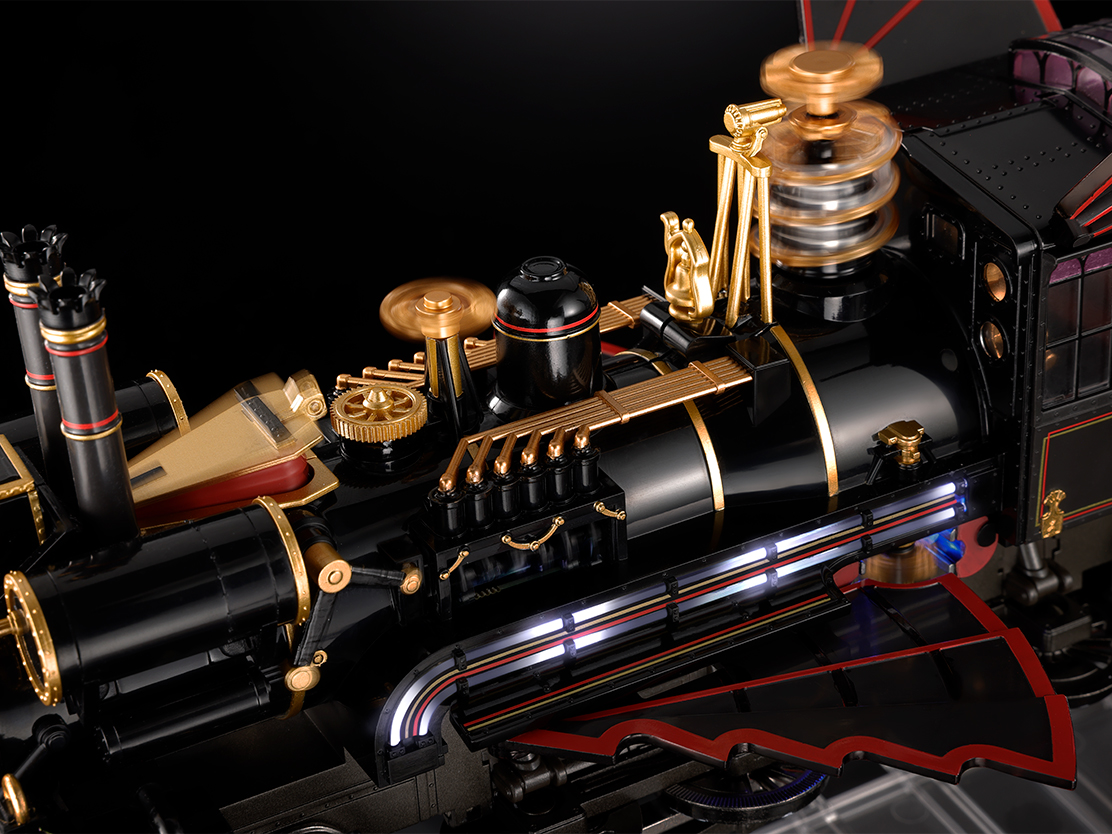 車体に搭載された各部スチームパンクなパーツはギアレーションにてそれぞれ回転数や方向を変えて電動稼働。側面の白い発光も劇中に合わせてリレー動作を実現。