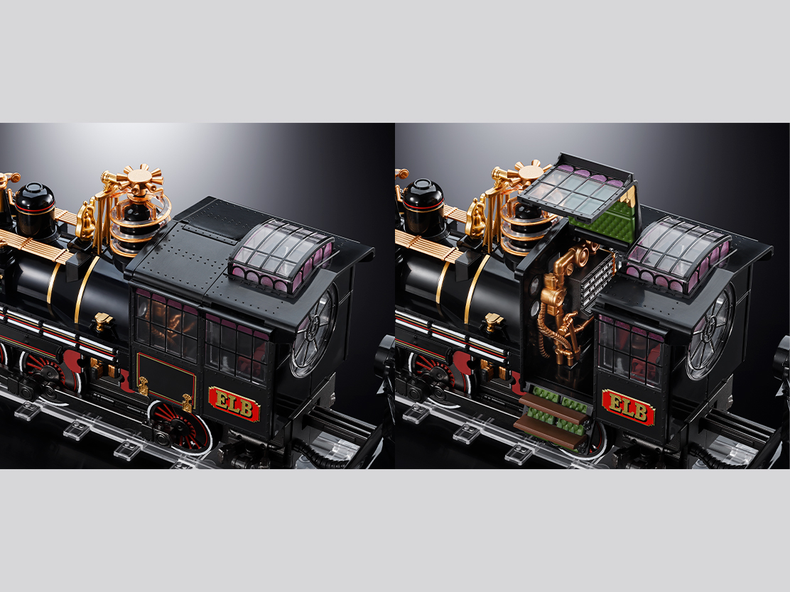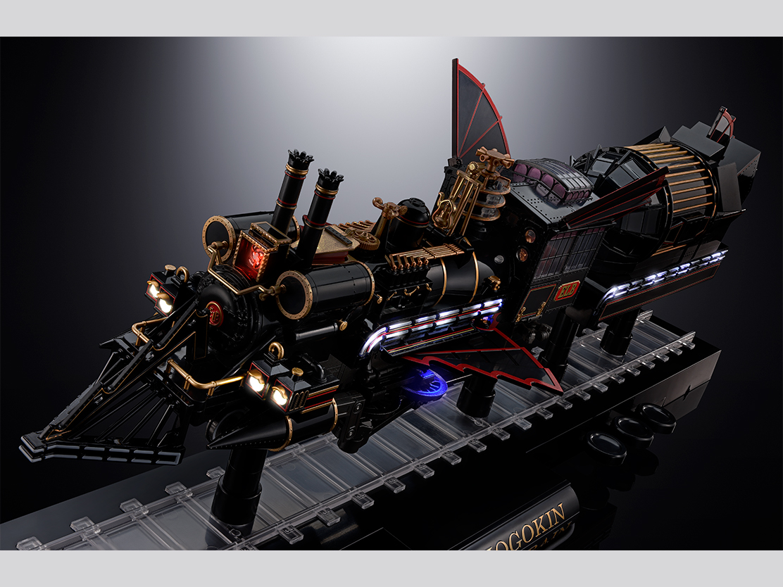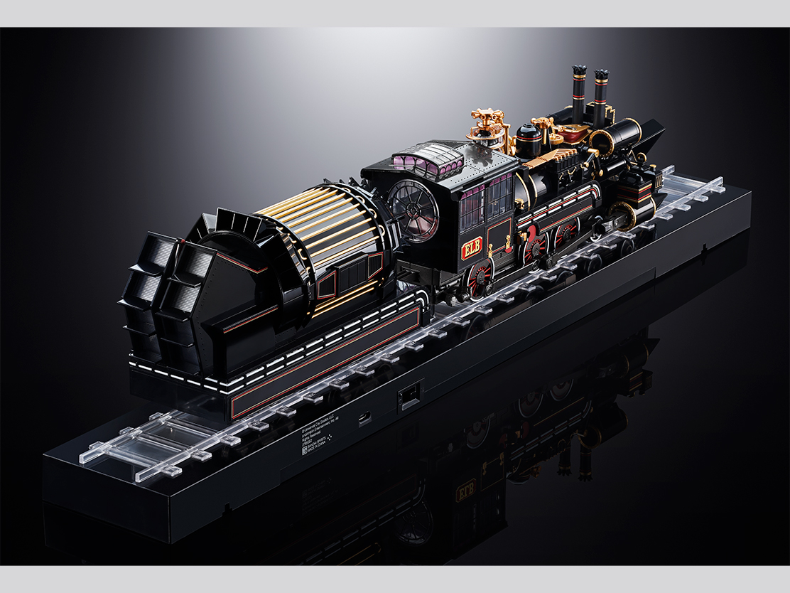 鉄道模型のOゲージ相当の大ボリューム。光る!動く!鳴る!56灯のLEDで劇中を想起する発光を実現。印象深いスチームパンクな部位もモーターライズで可動。SLのドラフト音もそれらに合わせて響く。飛行モードへの変形は羽などを一部差し換えによって再現。動輪は飛行モードになることで、連動作動を開始する。同スケールのフィギュアも付属し、劇中シーンが蘇る。
