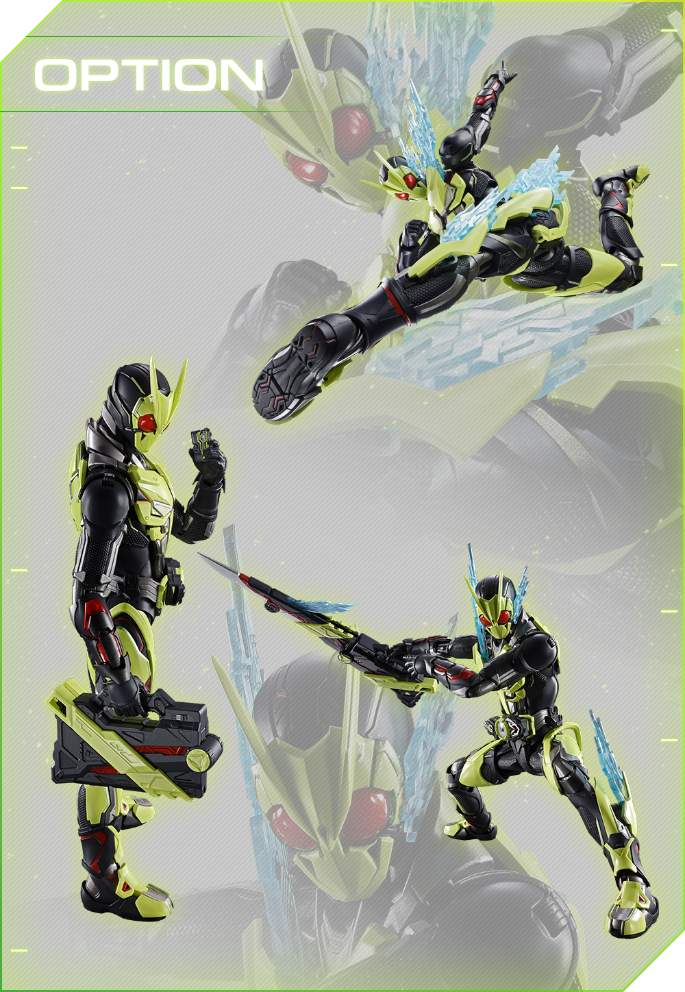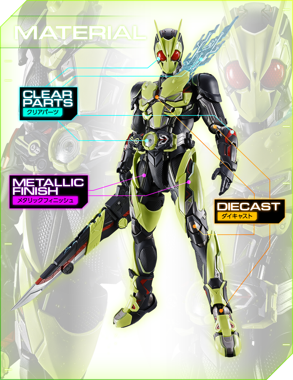 プロダクトデザイナー山下貴斗氏デザインアレンジ。ヒーローの体躯をベースに設計した新機構の数々。関節をはじめとした各所にダイキャストを使用。さらにメタリック彩色など素材面からも説得力を生み出す。劇中の演出を立体物に落とし込む豊富なエフェクトパーツが付属。新たに構築されたヒーローが夢に向かって今、飛び立つ。